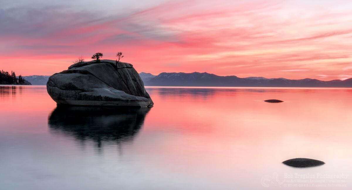 Bonsai Rock in Lake Tahoe, Nevada, is a large granite boulder just off the eastern shoreline. It's name comes from the two small "bonsai" trees growing in cracks at the top of the rock. The photo shows the rock in a mirror still lake with a red-orange sunset and distant mountain peaks in the background. There are two smaller rocks to the right that barely break the surface of the lake.