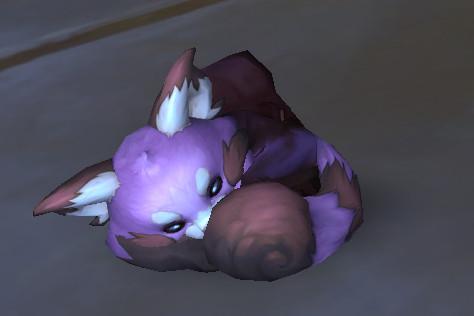 a screenshot from world of warcraft of the new twitch battle pet drop, the shadefur brewthief. they are small, round, and are colored pinkish-purple with brown patches of fur on their arms, feet and tail. the ears are fluffy and white. they also have a yellow bandana around their neck and are carrying a tiny brown backpack.