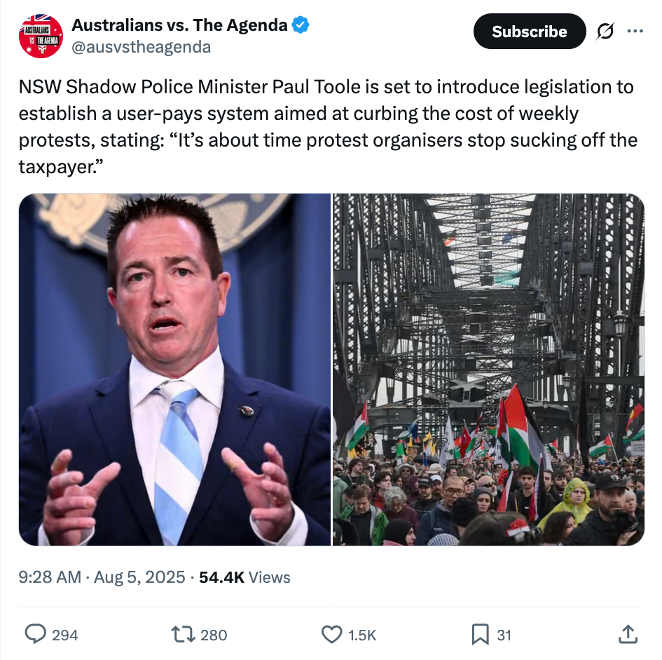 Screenshot of a tweet by @ausvstheagenda that reads: NSW Shadow Police Minister Paul Toole is set to introduce legislation to establish a user-pays system aimed at curbing the cost of weekly protests, stating: βItβs about time protest organisers stop sucking off the taxpayer.β