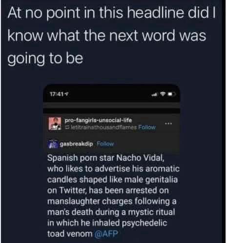 At no point in this headline did I know what the next word was going to be ... * gasbreakaip Spanish porn star Nacho Vidal, who likes to advertise his aromatic candles shaped like male genitalia on Twitter, has been arrested on manslaughter charges following a man's death during a mystic ritual in which he inhaled psychedelic toad venom