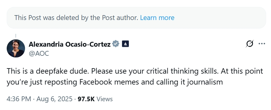 Alexandria Ocasio-Cortez @AOC Β· 3h Replying to @ChrisCuomo This is a deepfake dude. Please use your critical thinking skills. At this point youβre just reposting Facebook memes and calling it journalism