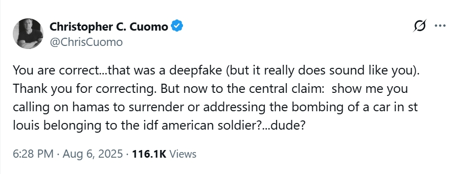 You are correct...that was a deepfake (but it really does sound like you). Thank you for correcting. But now to the central claim: show me you calling on hamas to surrender or addressing the bombing of a car in st louis belonging to the idf american soldier?...dude?