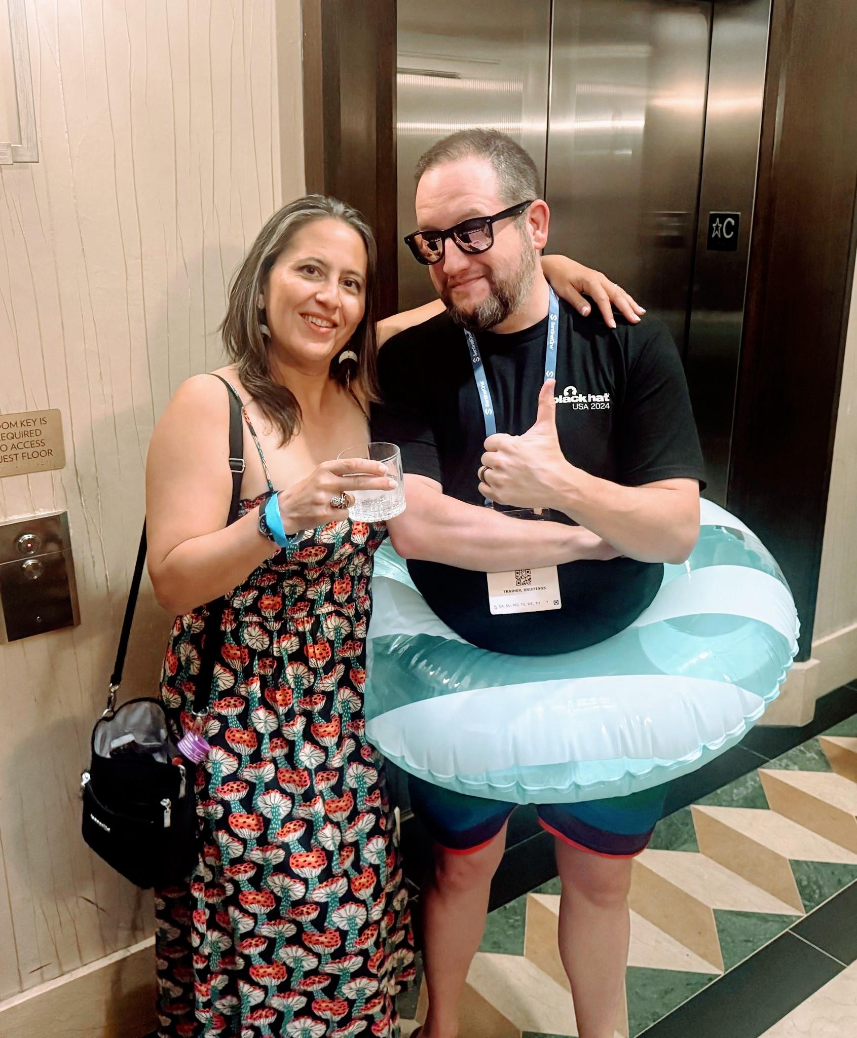 Photograph of a man and a woman in the Mandalay Bay hotel near the elevators to upper floors. She is holding a cocktail and wearing a pretty dress and has her arm around the man who is wearing rainbow striped bathing trunks, pink sunglasses, and inexplicably has a large pool floatie around his hips. The man is naturally giving a thumbs up with a grin.