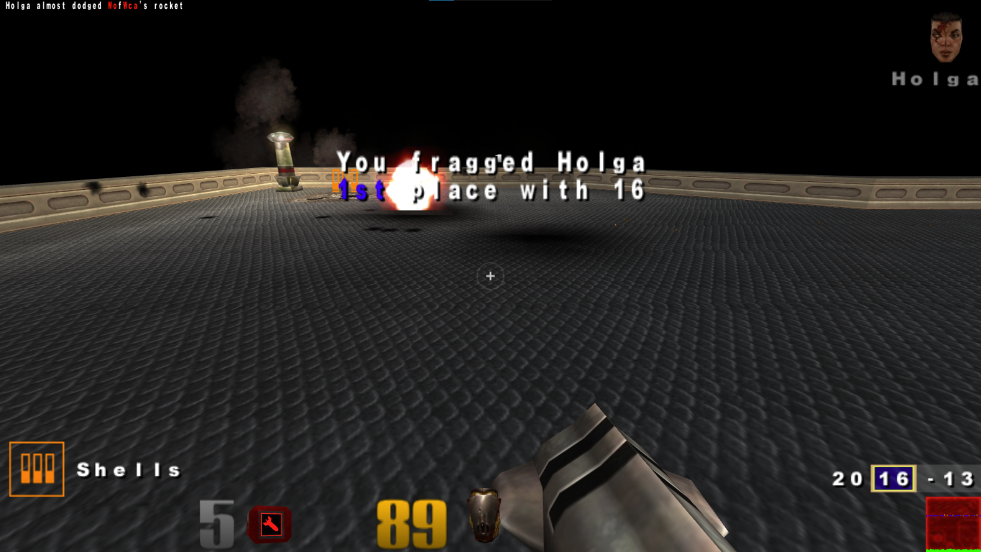screenshot of an in-game quake situation where the player just "fragged Holga, 1st place with 16" (kills)