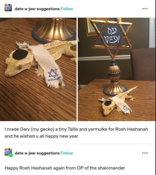a picture of a gecko named Gary with a tiny tallis and yarmulke in front of a bell reading "Oy vey!" the caption reads "Happy Rosh Hashanah again from the shalomander"