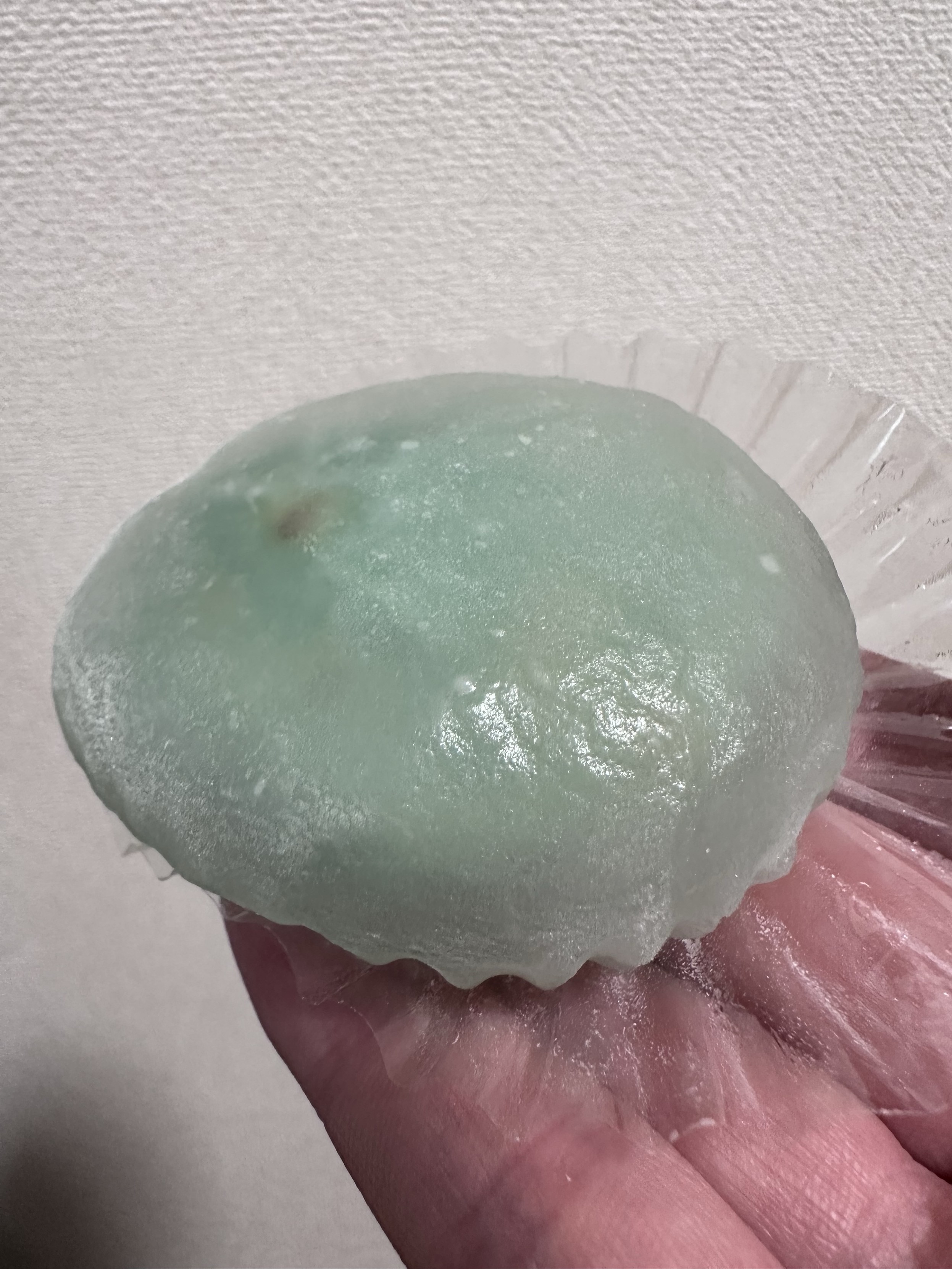 A hand is holding a large, oval-shaped dessert with a translucent green exterior. The dessert appears to be a type of mochi, served on a paper liner, and is set against a light-colored background.