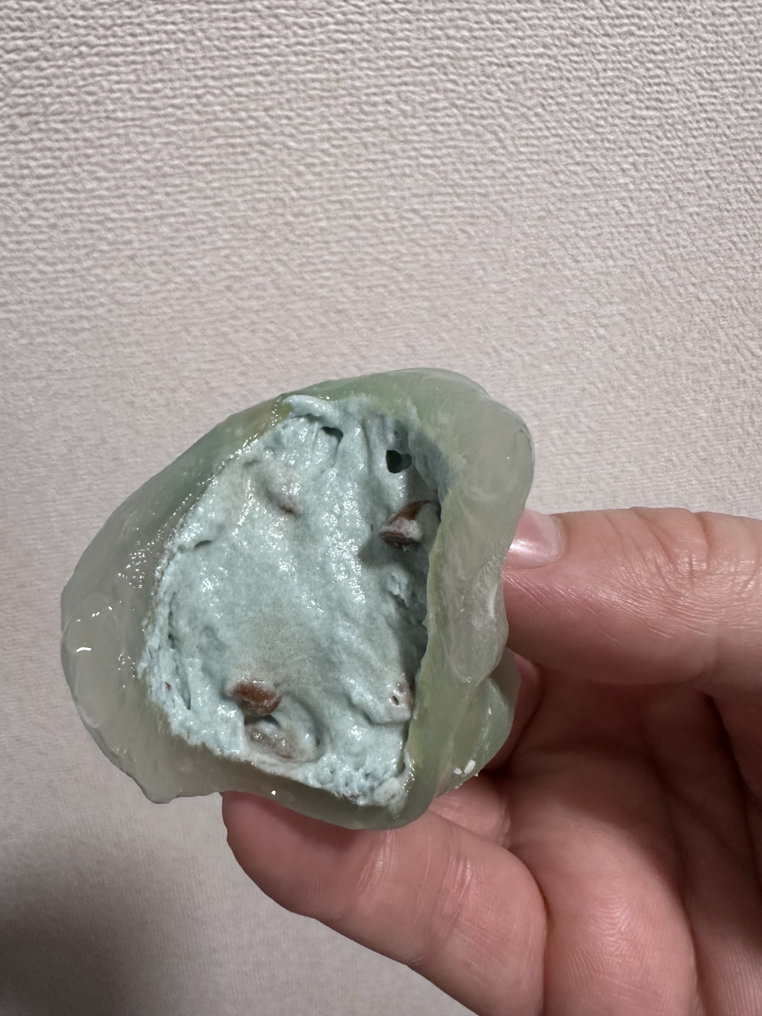 A hand is holding a piece of green jelly-like substance, revealing a pale blue interior dotted with small brown bits. The background features a light textured surface.