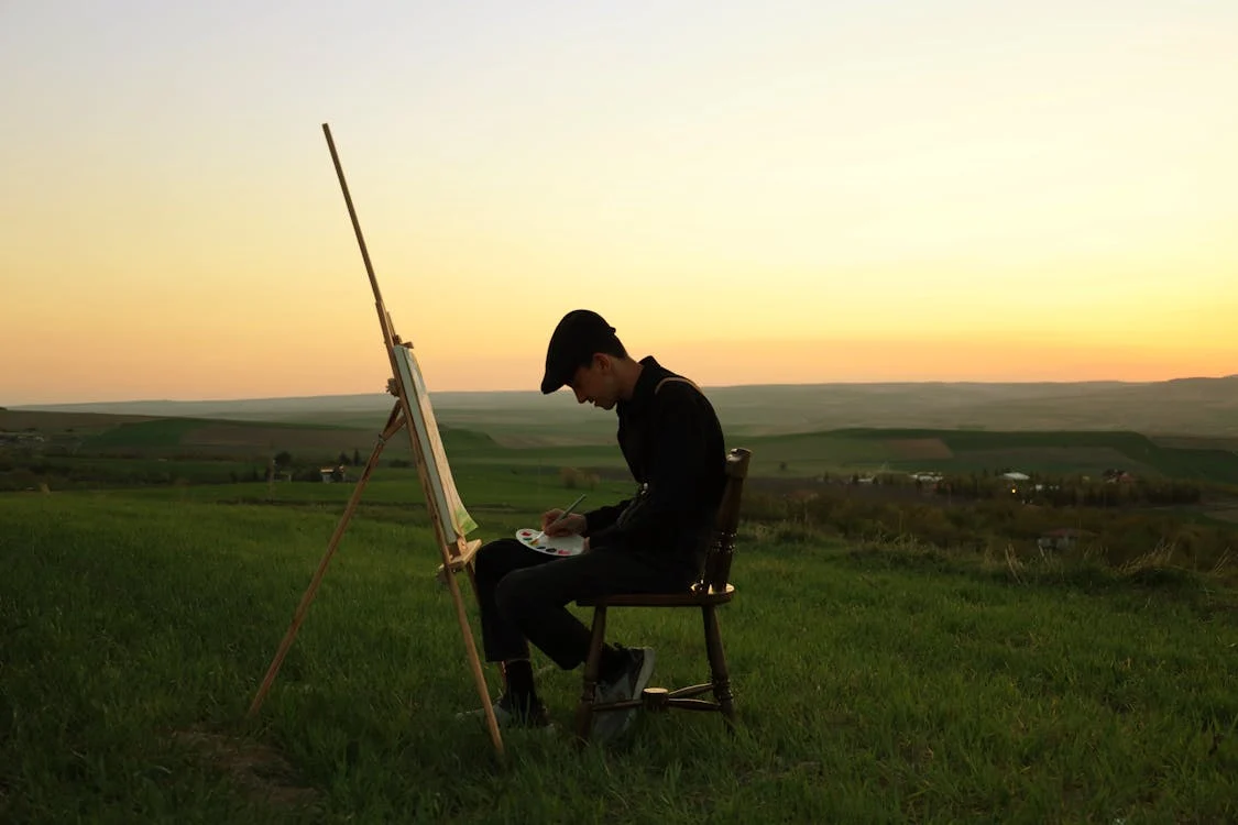 A masc figure sits on a wooden chair in a field, in front of an easel, with a paint palette in their lap. They're wearing black with a black peaked cap. The sky behind them is pastel orange.
