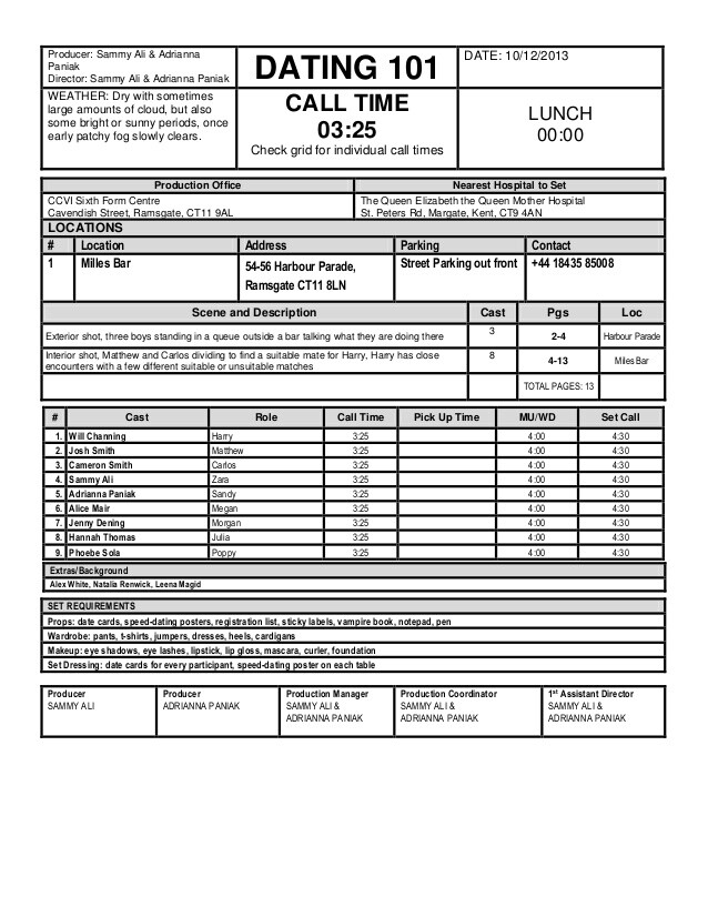 A generic production call sheet