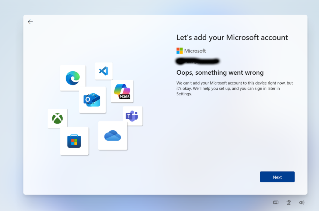 Screen with error about inability to create microsoft account during windows installation. I don't mind this unexpected turn, though.