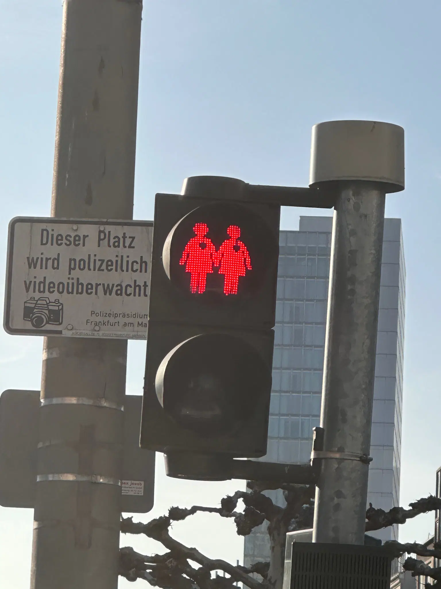A red pedestrian signal with two mannequins in dresses holding hands with a heart on their chest. Suggesting they are a same-sex couple.