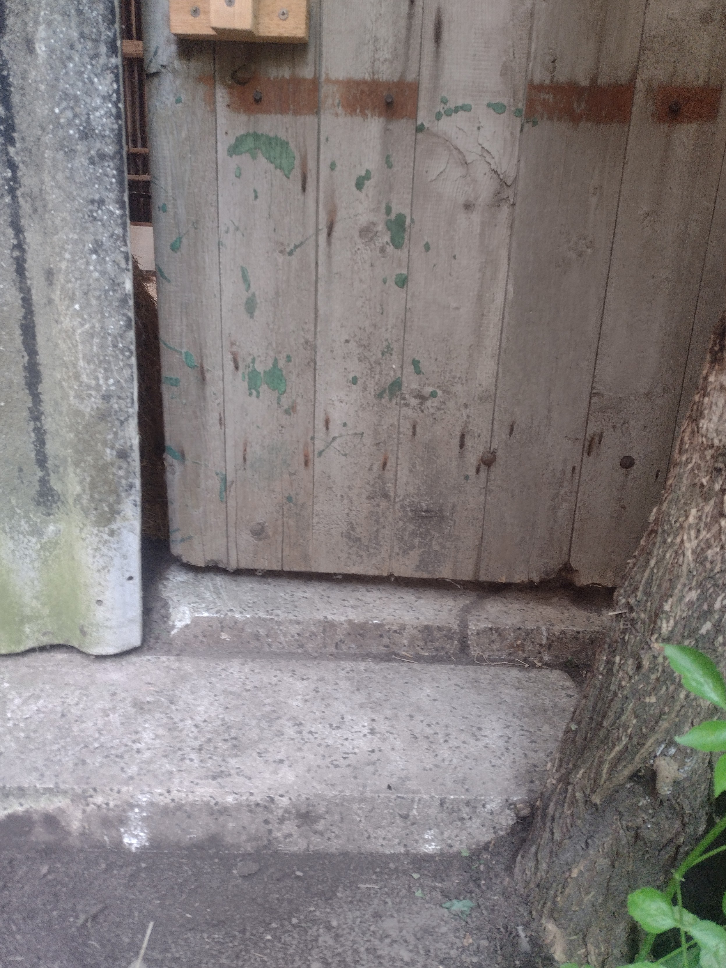 Das Bild zeigt das untere Ende einer alten Brettertรผr รผber einer Steinschwelle und einer vorgelagerten Treppenstufen aus dem gleichen Material.