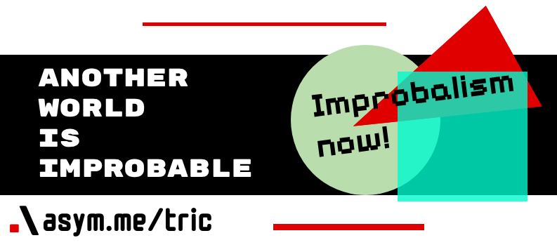 "Another Wold is Improbable" written on bold text "Improbablism Now!" in pixalated text. ".\ asym.me/tric" using a monospace font text appears featuring bold geometric layout