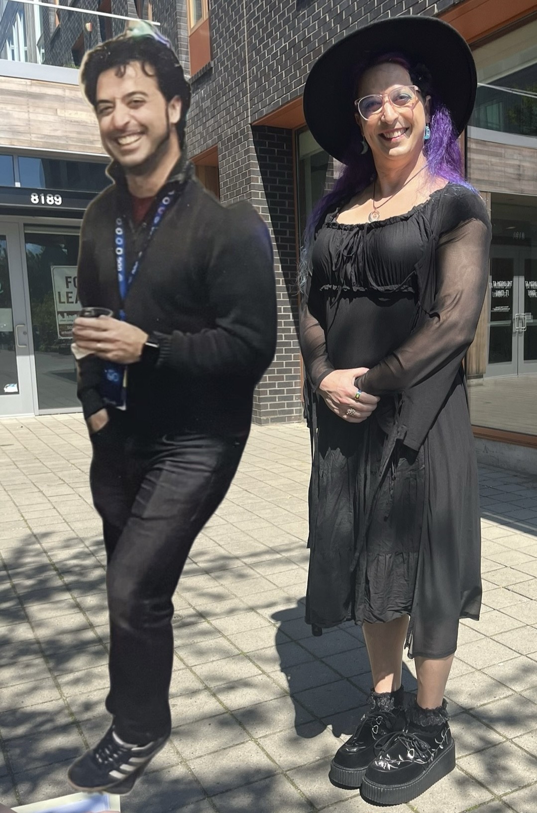 An old picture of Nora presenting masculine pasted next to a recent photo of Nora looking much more femme. Theyβre in similar standing and smiling poses but otherwise thereβs obvious differences in their appearance, despite what my stupid brain says about nothing changing.