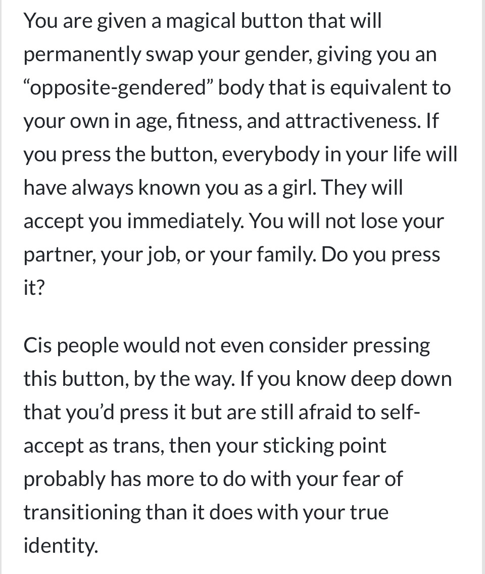 You are given a magical button that will permanently swap your gender, giving you an โopposite-genderedโ body that is equivalent to your own in age, fitness, and attractiveness. If you press the button, everybody in your life will have always known you as a girl. They will accept you immediately. You will not lose your partner, your job, or your family. Do you press it? Cis people would not even consider pressing this button, by the way. If you know deep down that youโd press it but are still afraid to self-accept as trans, then your sticking point probably has more to do with your fear of transitioning than it does with your true identity.