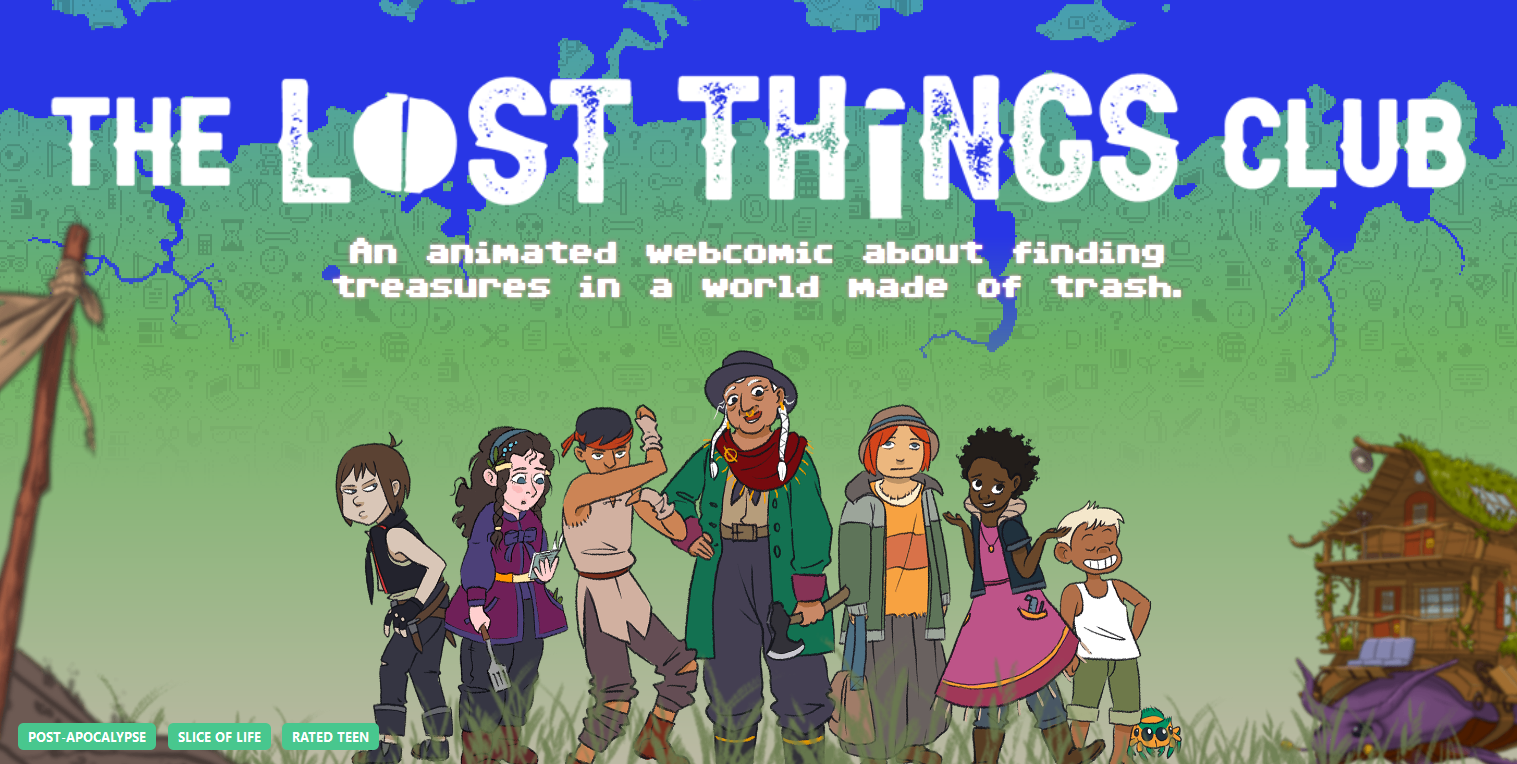 A old woman with an ax and six children stand in front of an alien world map. The Lost Things Club. An animated webcomic about finding treasures in a world made of trash. Post-apocolyptic, slice-of-life, rated teen.