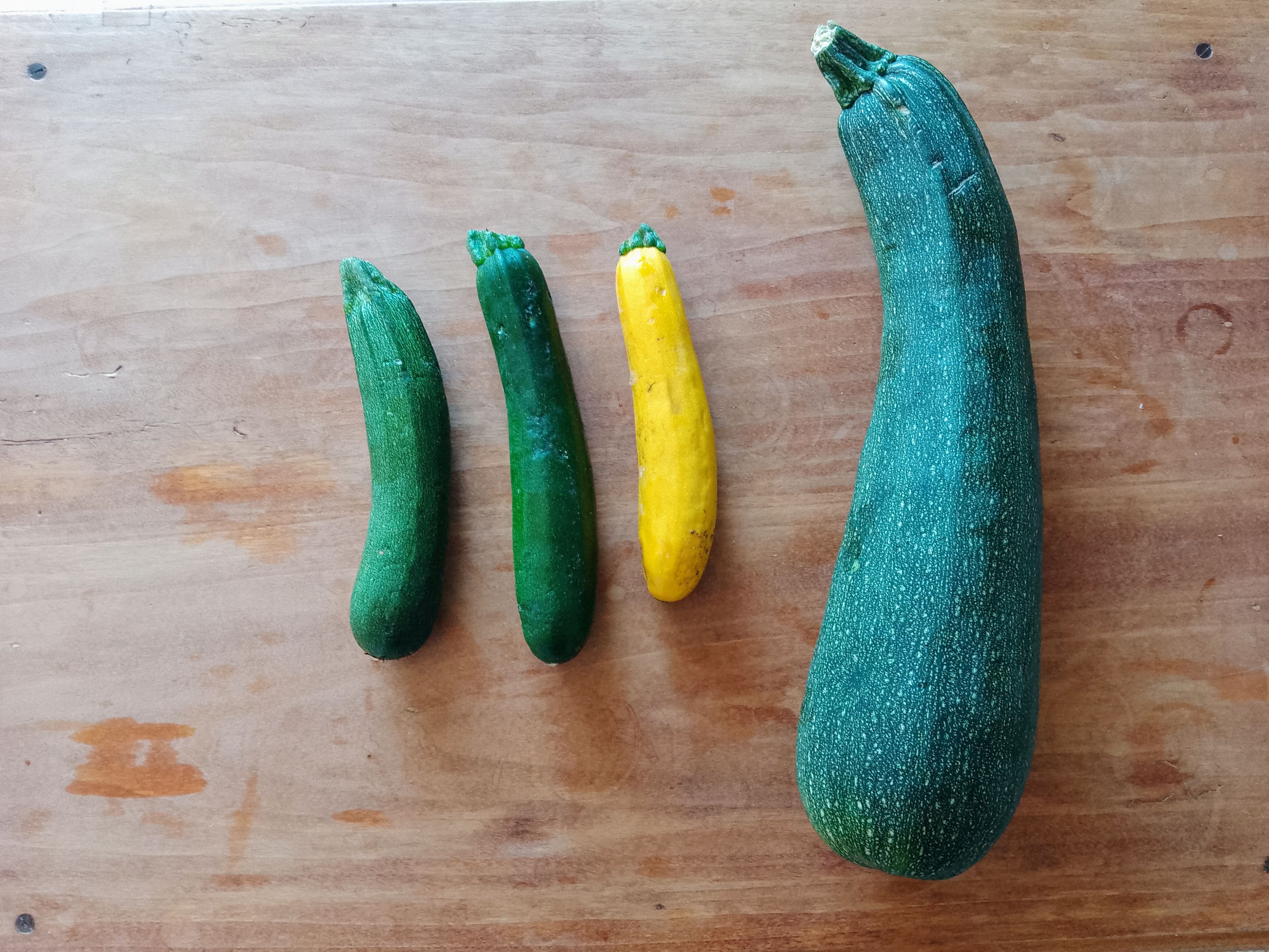 Photo de 4 courgettes sur une table en bois. De gauche à droite : 2 vertes et 1 jaune d'environ 20 cm de long, et la dernière disproportionnée par rapport aux autres (une massue !)