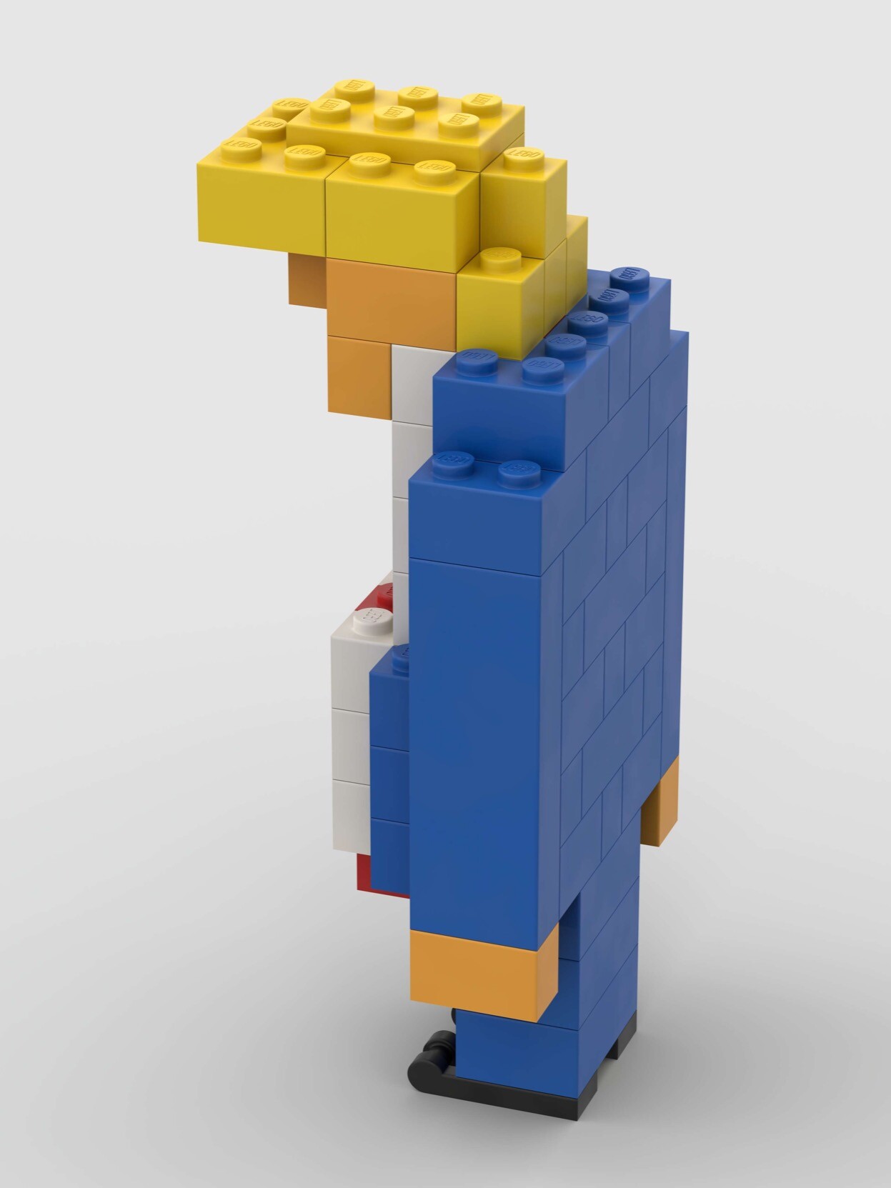 Grumpy Donald Trump as a LEGO build (left side view, slightly from the back).