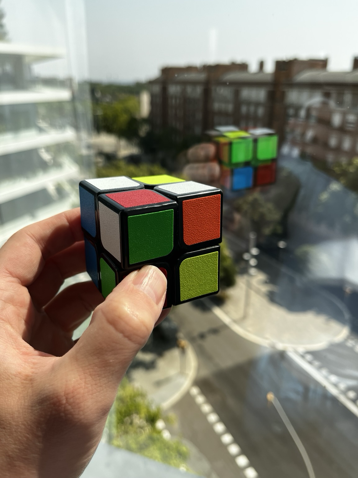 4x4 Rubikβs qube in my hand with window and Barcelonaβs Poblenou in the background