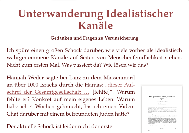 Unterwanderung Idealistischer Kanäle Ich spüre einen großen Schock darüber, wie viele vorher als idealistisch wahrgenommene Kanäle auf Seiten von Menschenfeindlichkeit stehen. Nicht zum ersten Mal. Was passiert da? Wie lösen wir das? Hannah Weiler sagte bei Lanz zu dem Massenmord an über 1000 Israelis durch die Hamas: „dieser Aufschrei der Gesamtgesellschaft … [fehlte]“. Warum fehlte er? Konkret auf mein eigenes Leben: Warum habe ich 4 Wochen gebraucht, bis ich einen Video-Chat darüber mit einem befreundeten Juden hatte? Der aktuelle Schock ist leider nicht der erste: