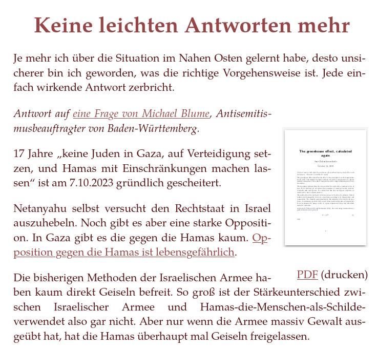 Keine leichten Antworten mehr Je mehr ich über die Situation im Nahen Osten gelernt habe, desto unsicherer bin ich geworden, was die richtige Vorgehensweise ist. Jede einfach wirkende Antwort zerbricht. Antwort auf eine Frage von Michael Blume, Antisemitismusbeauftragter von Baden-Württemberg. 17 Jahre „keine Juden in Gaza, auf Verteidigung setzen, und Hamas mit Einschränkungen machen lassen“ ist am 7.10.2023 gründlich gescheitert. Netanyahu selbst versucht den Rechtstaat in Israel auszuhebeln. Noch gibt es aber eine starke Opposition. In Gaza gibt es die gegen die Hamas kaum. Opposition gegen die Hamas ist lebensgefährlich. Die bisherigen Methoden der Israelischen Armee haben kaum direkt Geiseln befreit. So groß ist der Stärkeunterschied zwischen Israelischer Armee und Hamas-die-Menschen-als-Schilde-verwendet also gar nicht. Aber nur wenn die Armee massiv Gewalt ausgeübt hat, hat die Hamas überhaupt mal Geiseln freigelassen.