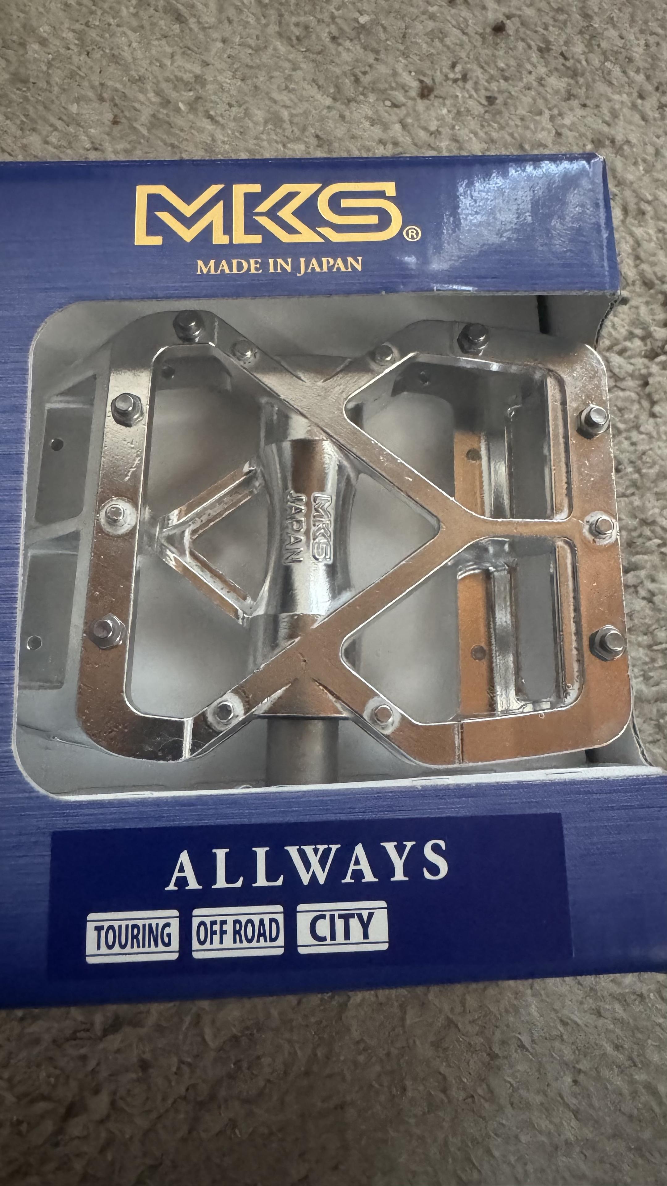 Ein Fahrradpedal-Set, verpackt in einer blauen Schachtel mit der Aufschrift "MKS Made in Japan" und "ALLWAYS". Das Pedal ist fΓΌr den Touring-, Offroad- und Stadtgebrauch konzipiert.