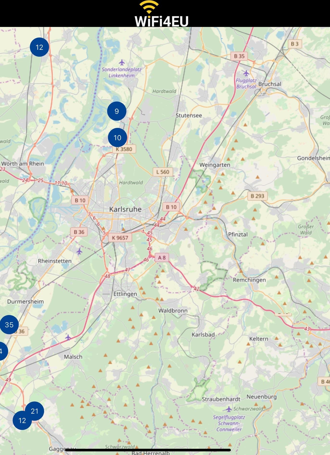 Map of surrounding Karlsruhe area showing that there is no service in Karlsruhe, only in some surrounding areas.