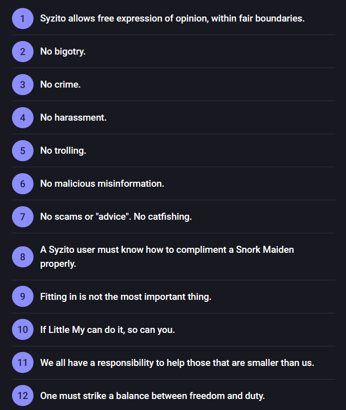 1 Syzito allows free expression of opinion, within fair boundaries. 2 No bigotry. 3 No crime. 4 No harassment. 5 No trolling. 6 No malicious misinformation. 7 No scams or "advice". No catfishing. 8 A Syzito user must know how to compliment a Snork Maiden properly. 9 Fitting in is not the most important thing. 10 If Little My can do it, so can you. 11 We all have a responsibility to help those that are smaller than us. 12 One must strike a balance between freedom and duty.
