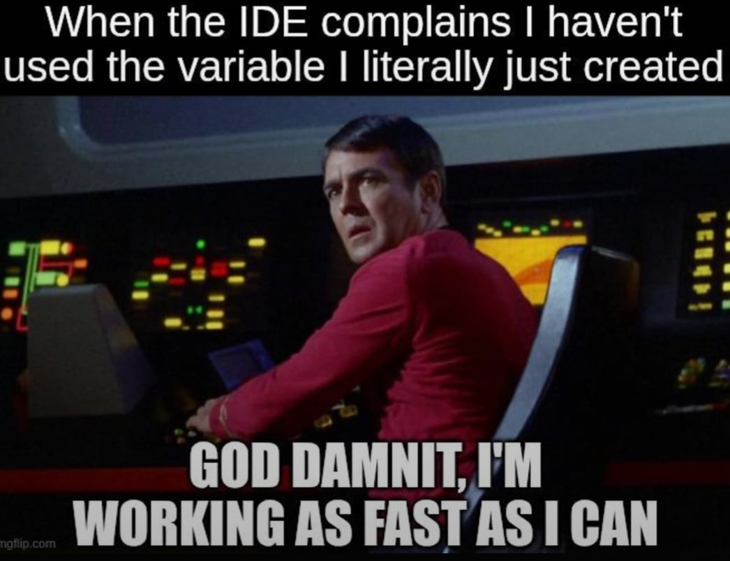 Scotty on the enterprise When the IDE complains I haven't used the variable I literally just created GOD DAMNIT, I'M WORKING AS FAST AS I CAN