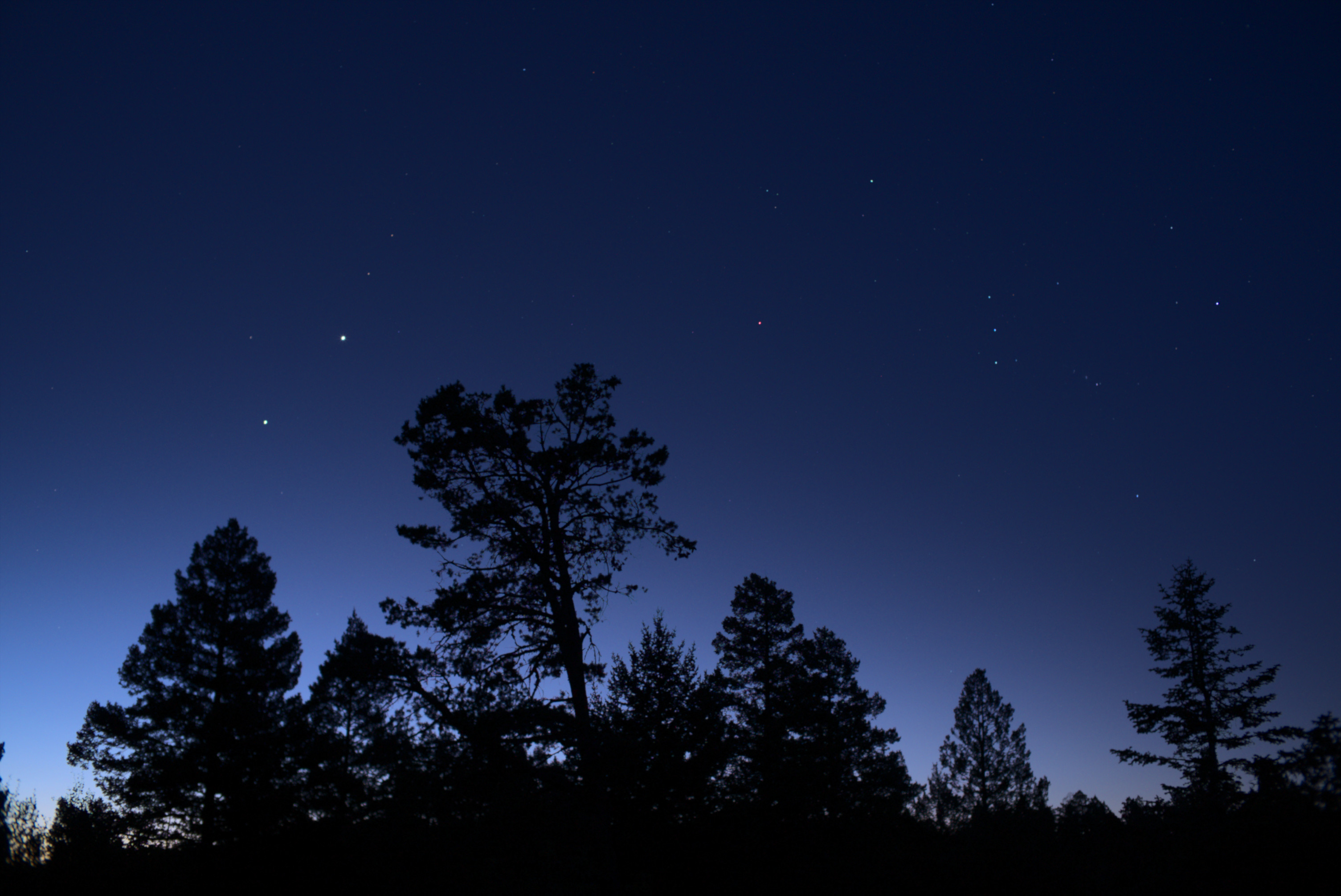Venus and Jupiter, brightest objects in the frame, are moving closer together day by day for the next several days. Morning twilight is bright enough to overwhelm the fainter stars, so only the bright stars of Orion stand out with these two bright planets.