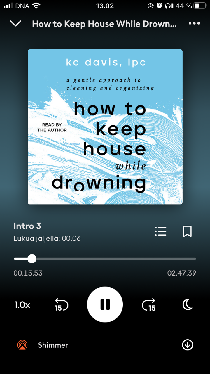 screenshot of an audio book titled. how to keep house while drowning. a gentle approach to cleaning and organising. written by kc davis, lpc.