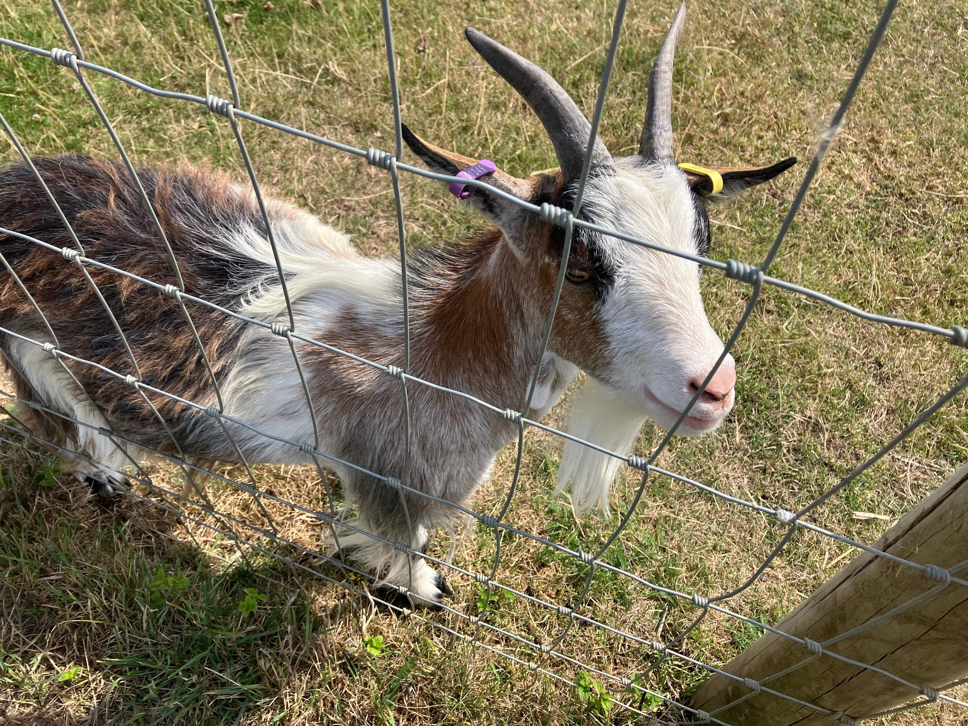 Photo of another brown and white goat pressed up against the fence for scritches. They also have fine horns and a very impressive white beard.