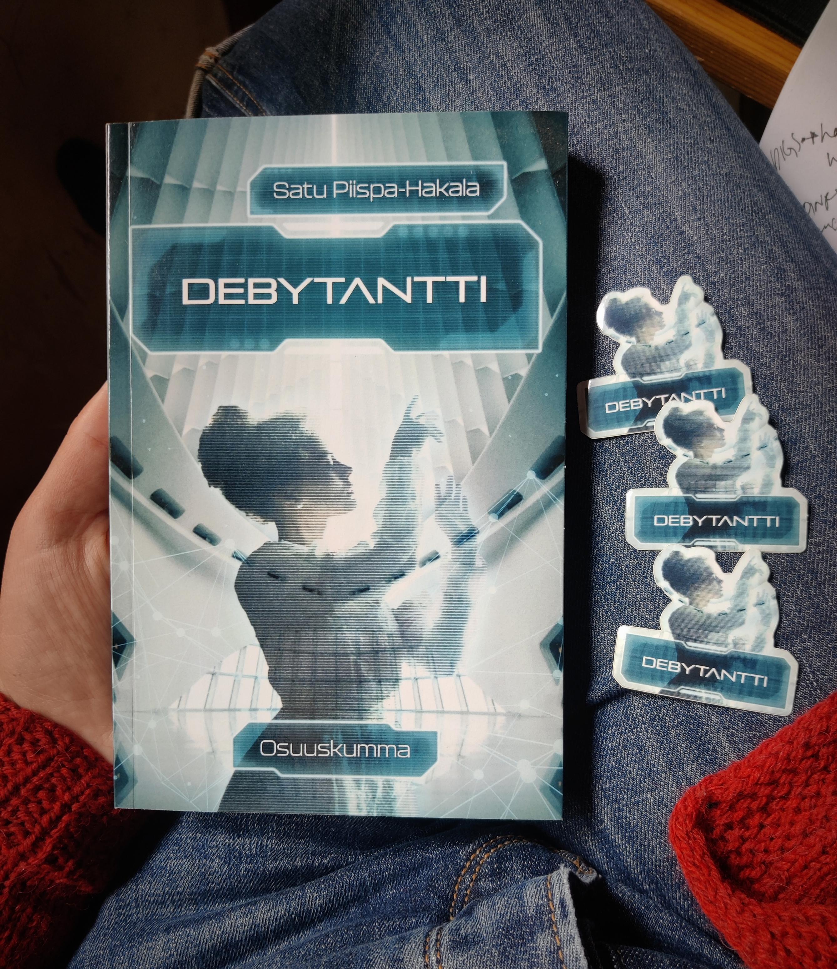 Kuva kirjasta, joka lepää ihmisen sylissä. Kirjan nimi on Debytantti. Oikealla kirjan vieressä on kolme tarraa, joissa on sama kuva kuin kirjan kannessa - nutturapäinen nainen ehkä 1900-luvun alun vaatteissa, mutta futuristiseksi muokattuna - sekä tekstin Debytantti.