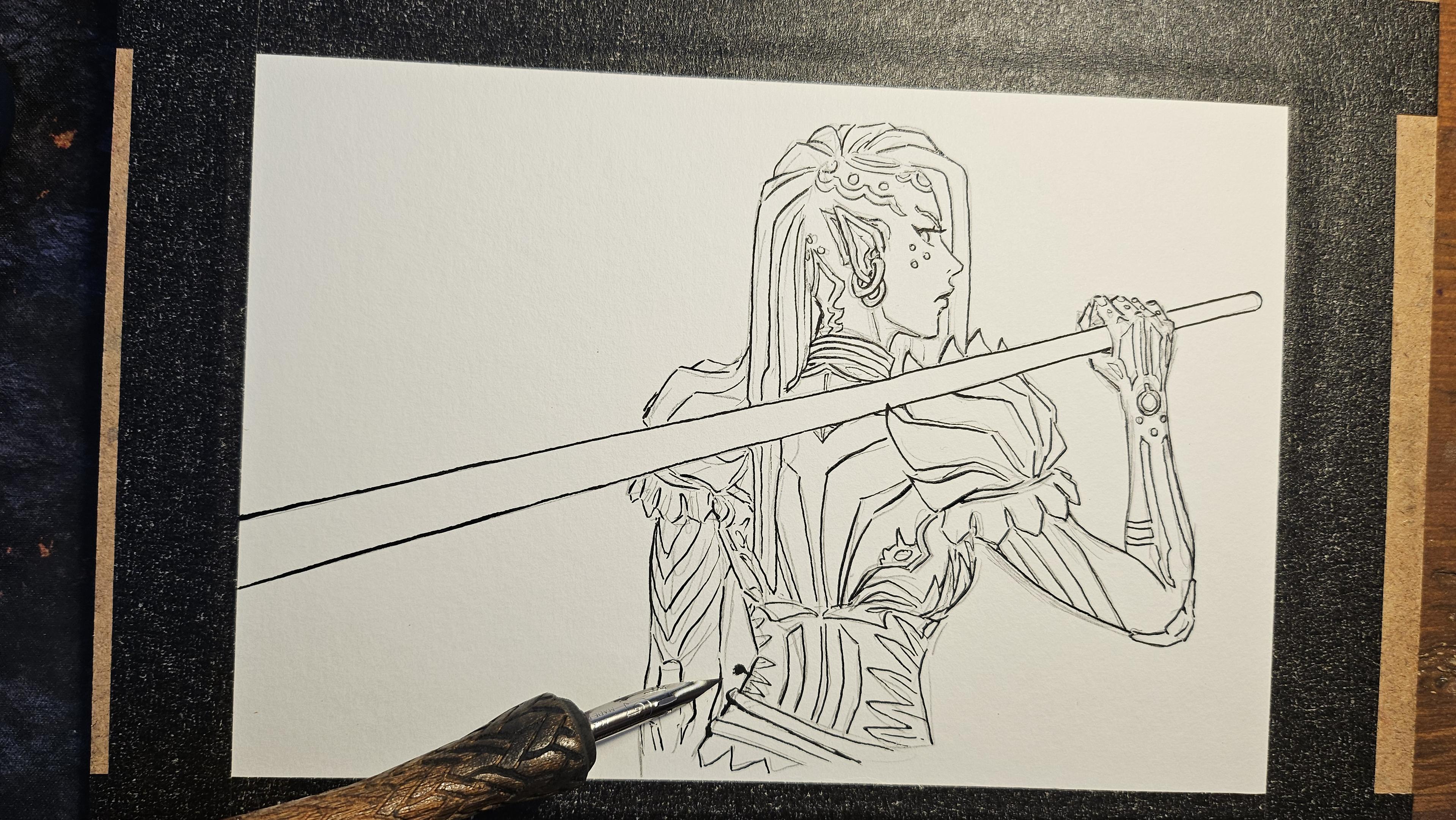 A space elf resting a pool cue (that's what they're called right?) on her shoulder. She's looking over said shoulder at us
