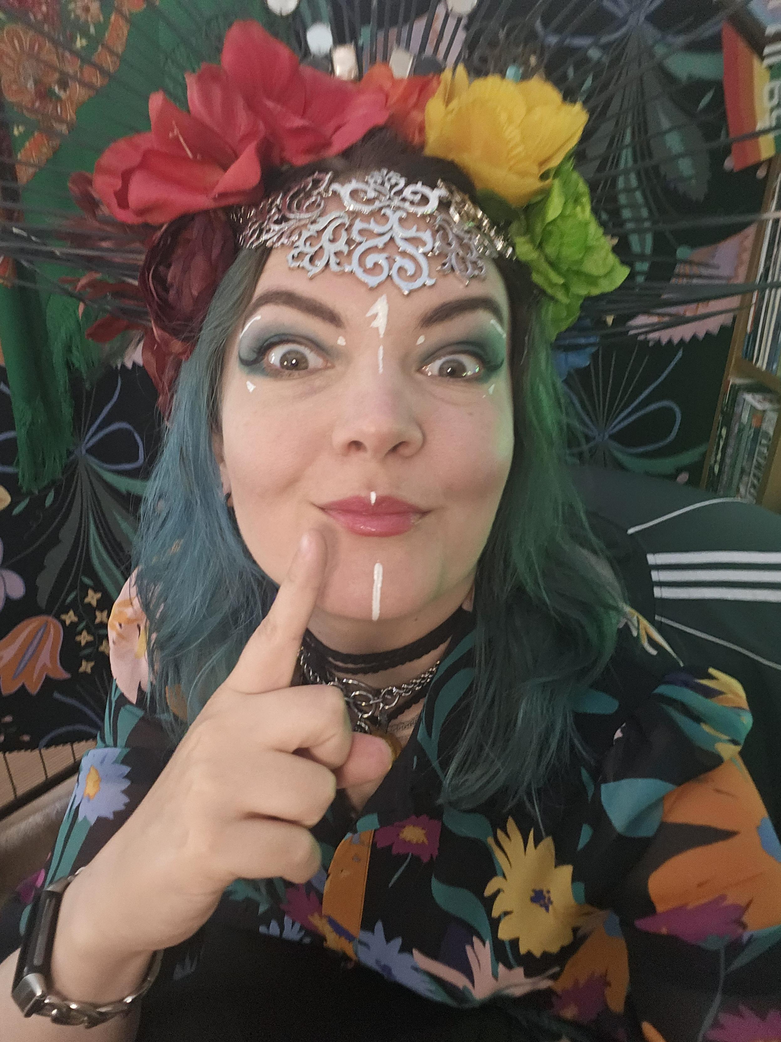 Selfie of a dressed up Jen with a flowery headdress and flowery dress. She is also wearing some facepaint and looking.... cheeky?