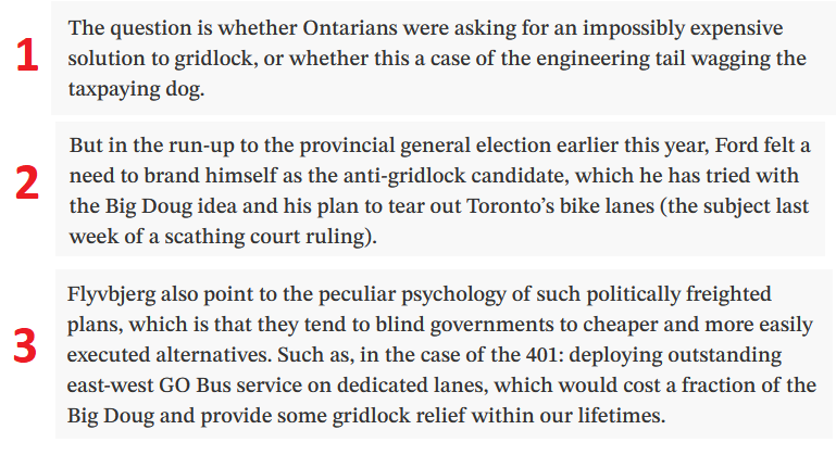 Three excerpted paragraphs from the linked to article. They read: 1. "The question is whether Ontarians were asking for an impossibly expensive solution to gridlock, or whether this a case of the engineering tail wagging the taxpaying dog." 2. "But in the run-up to the provincial general election earlier this year, Ford felt a need to brand himself as the anti-gridlock candidate, which he has tried with the Big Doug idea and his plan to tear out Torontoβs bike lanes (the subject last week of a scathing court ruling)." 3. "Flyvbjerg also point to the peculiar psychology of such politically freighted plans, which is that they tend to blind governments to cheaper and more easily executed alternatives. Such as, in the case of the 401: deploying outstanding east-west GO Bus service on dedicated lanes, which would cost a fraction of the Big Doug and provide some gridlock relief within our lifetimes."