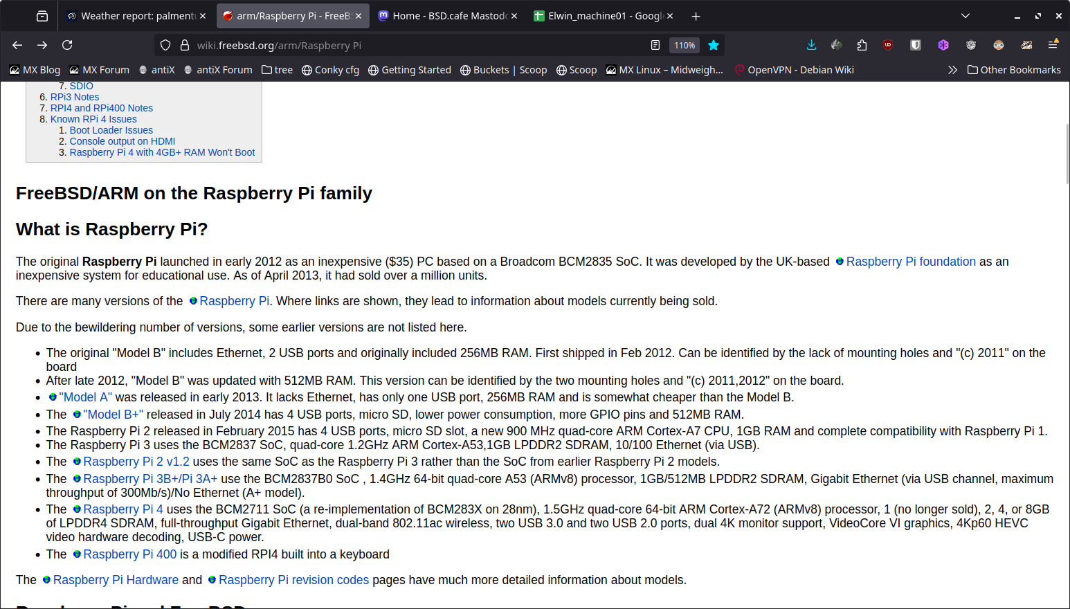 The image shows a computer screen displaying a webpage about the Raspberry Pi family and FreeBSD/ARM. The webpage is titled "FreeBSD/ARM on the Raspberry Pi family" and discusses the Raspberry Pi's history and various models. The top of the page includes a browser's address bar with several tabs open, including "Weather report," "MX Forum," and "wiki.FreeBSD.org/Raspberry_Pi." The main content of the page is a detailed article about the Raspberry Pi, including its development, models, and specifications. The article mentions the original Raspberry Pi's launch in early 2012 and its development by the UK-based Raspberry Pi Foundation. It also lists the different models, such as the Model B, Model A, Model B+, Model 2, Model 3, and Model 4, along with their respective features and release dates. The article provides information on the Raspberry Pi's processor, RAM, and other hardware specifications. The webpage is well-structured, with a clear heading, subheadings, and a list of links to related content. Provided by @altbot, generated privately and locally using Ovis2-8B 🌱 Energy used: 0.218 Wh