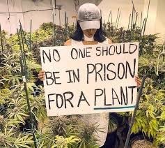 A person wearing a cap is holding a sign that reads, "NO ONE SHOULD BE IN PRISON FOR A PLANT," amidst a background of cannabis plants.
