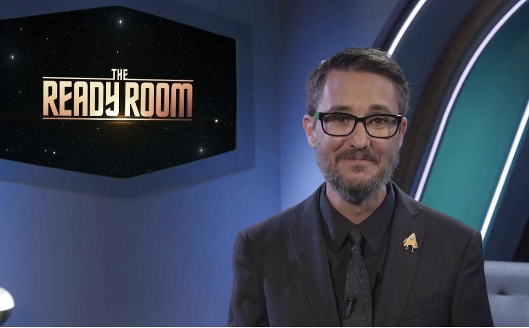 Will Wheaton with a sweet little smile. He looks about little sad or maybe I'm projecting. 😕 He is wearing s dark suit, glasses and there's a gold delta pin on his lapel. Behind him is a small viewscreen with the shows title showing: The Ready Room.