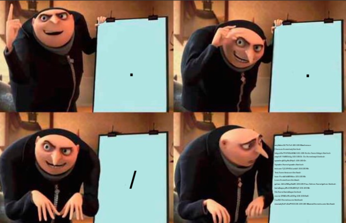 Gru is explaining a plan. Panel one: He's excited about the page that says "." Panel two: He's excited about another page that says "." Panel three: He's excited about the page that says "/" Panel four: He's confused about a page that appears to be /etc/passwd