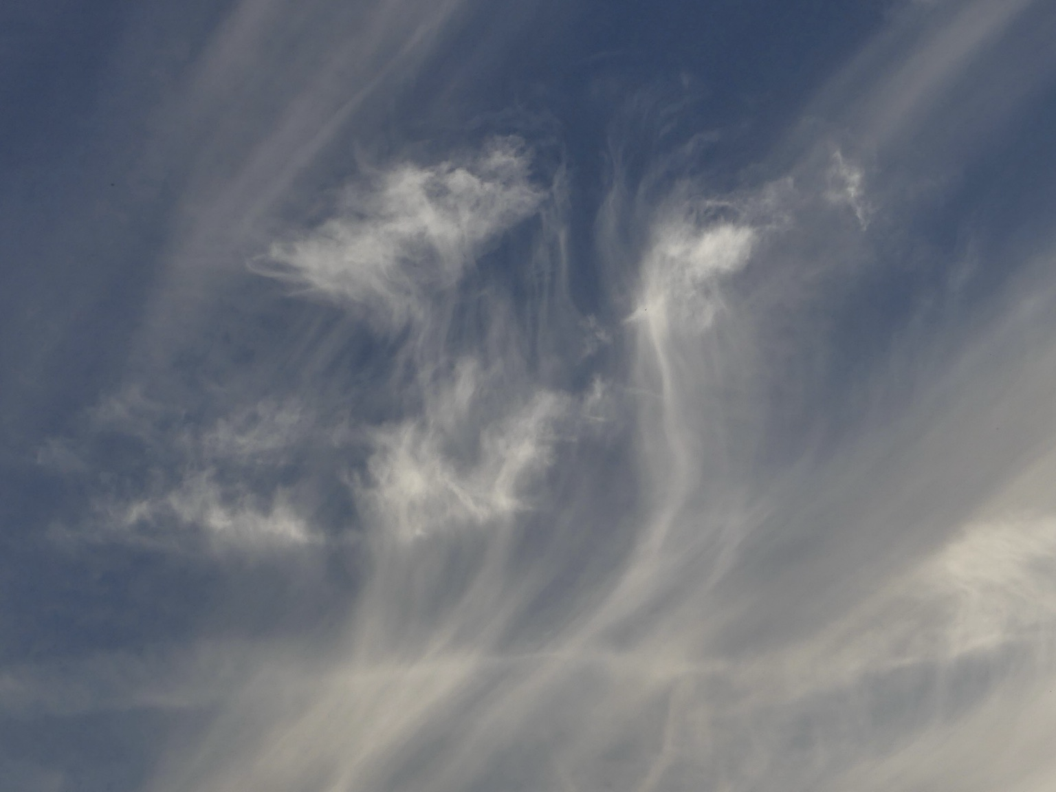 Interesting wispy cloud formations in the evening sky. I see an unidentified being riding a sea serpent