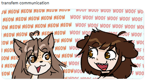 A picture captioned "transfem communication" It shows a girl with cat years, behind her a long list of "meows" and a girl with puppy ears, behind her a long list of "woof".