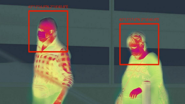 Bild zeigt zwei Menschen mit Mundschutz via Infrarot mit einem Kasten mit Nummer um den Kopf zur biometrischen Gesichtserkennung