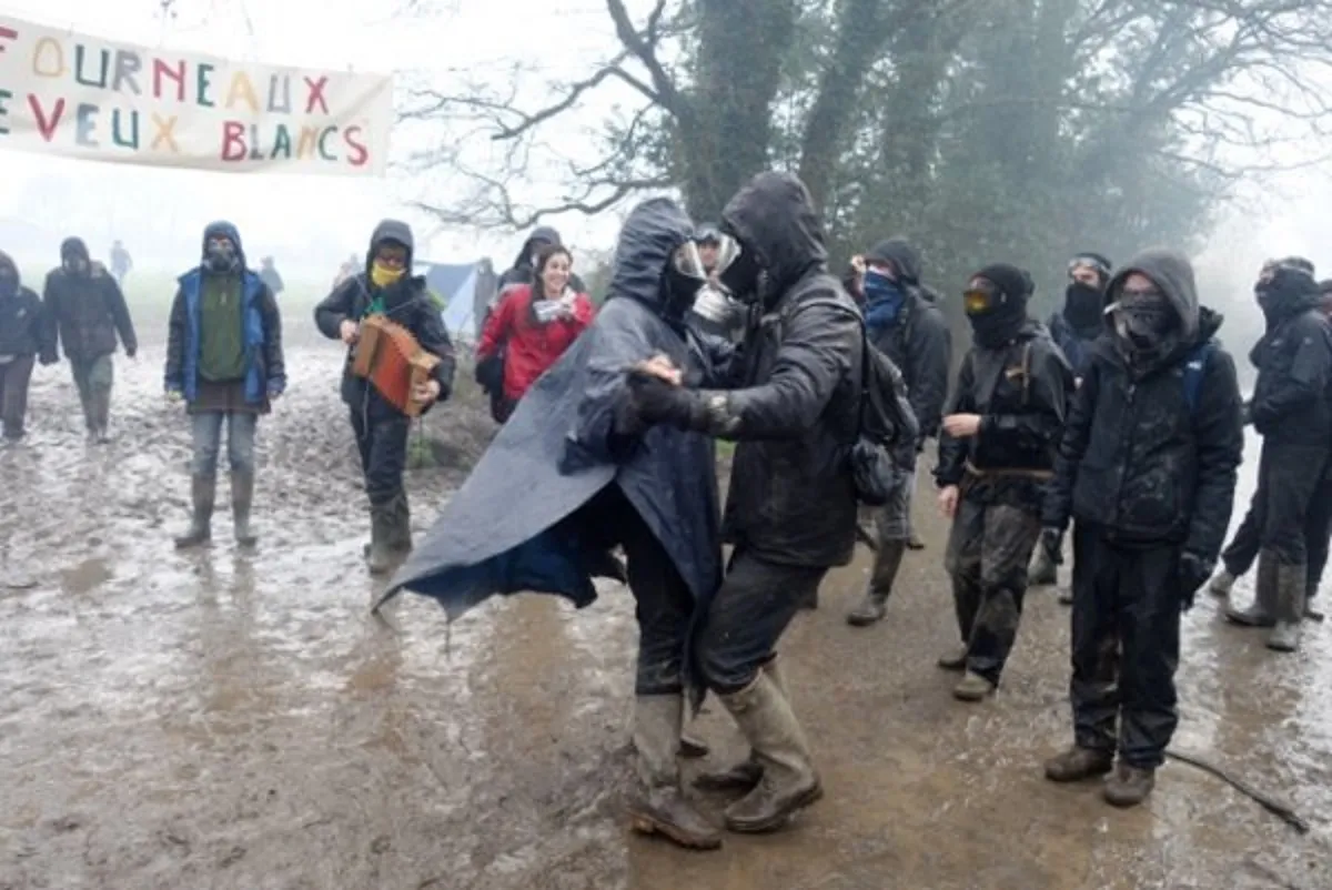 zwei mit Grummistiefeln und schwarzen RegenmΓ€nteln sowie Gasmasken, tanzende Menschen im Schlamm. Im Hintergrund ein paar weitere vermummte Menschen. Einer mit einem Akkordeon.