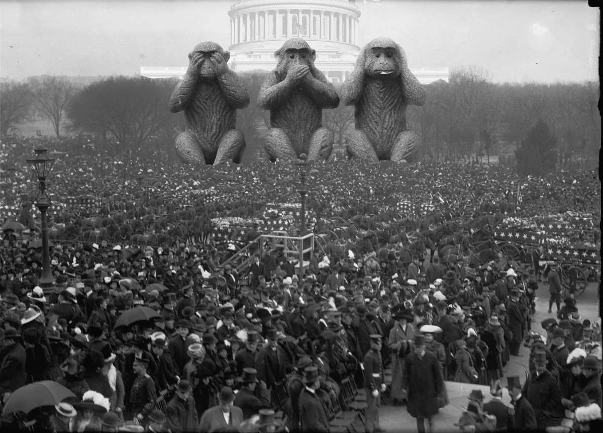 A black and white photo of a massive crowd (a 1910s Mayday parade); matted into the background of the photo are the three wise monkeys, posed before a cloud-shrouded capitol building." Image: Japanexperterna.se (modified) https://www.flickr.com/photos/japanexperterna/15251188384/ CC BY-SA 2.0: https://creativecommons.org/licenses/by-sa/2.0/