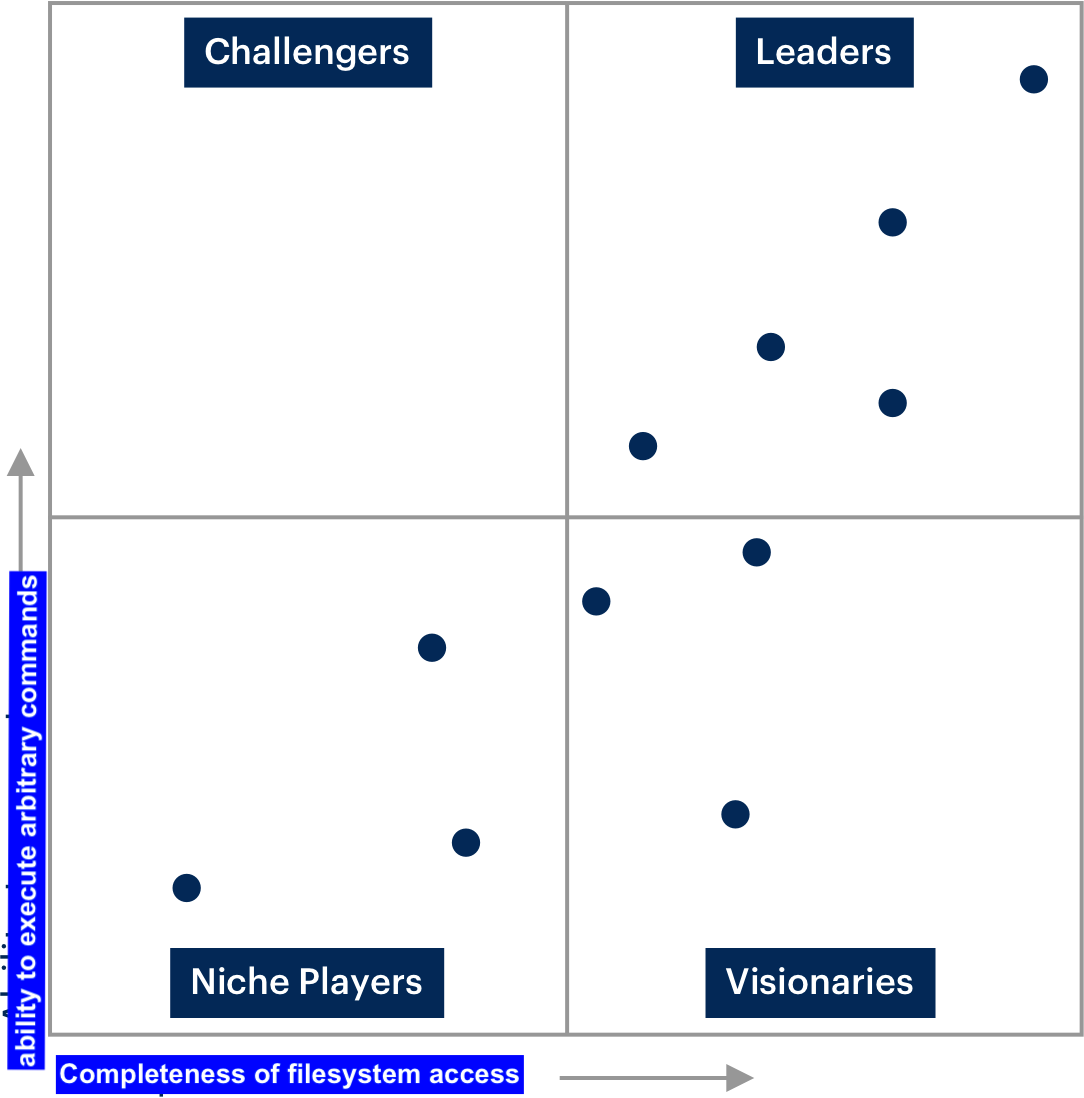 a gartner magic quadrant but the Y axis is "ability to execute arbitrary commands" and the X axis is "completeness of filesystem access"