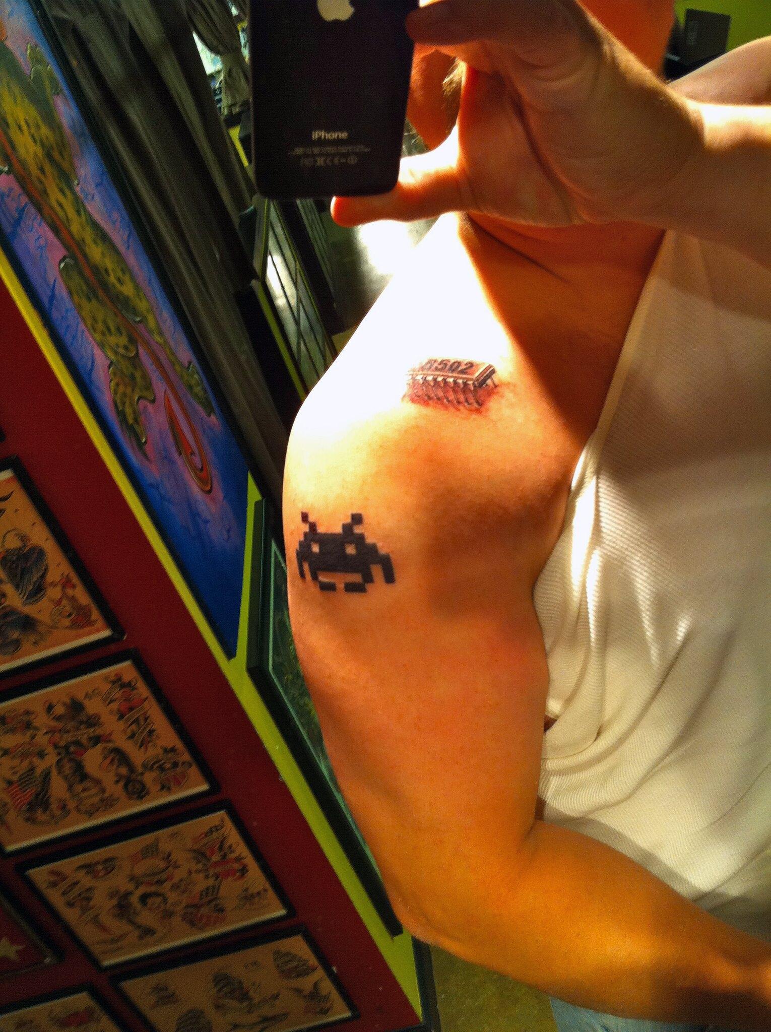Arm tattoo of a 6502 chip and a Space Invader squid