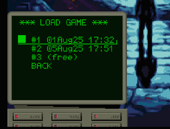 Title screen's menu showing the load options with the available load slots with the last save date.