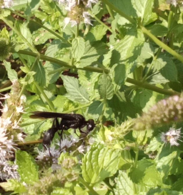 Great black wasp in profile on mint flower head.
