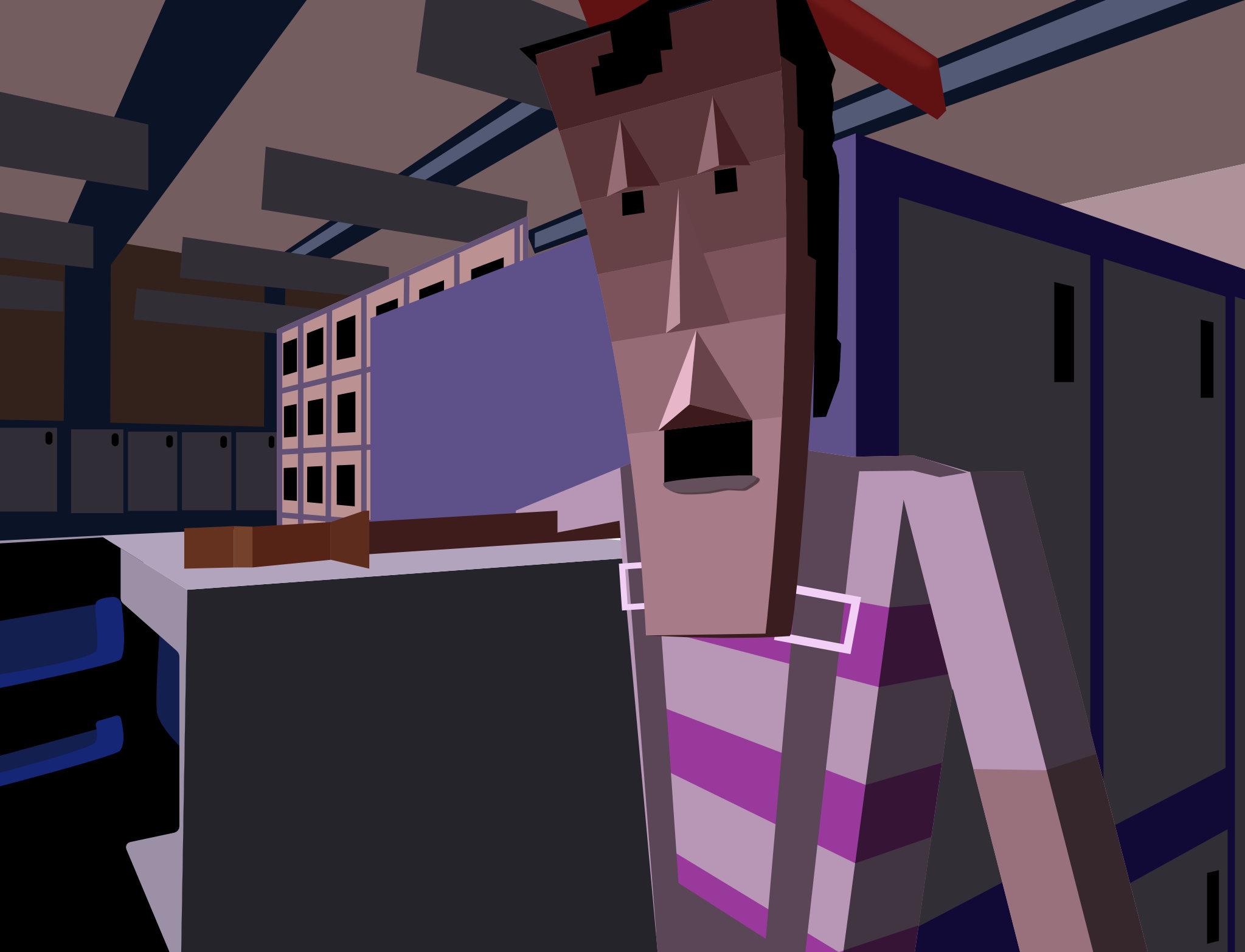 Vector drawing of a still from the seminal Dire Straits video to "Money for Nothing", 1985. One, very low-poly, 3D rendered handyman is leaning on a refridgerator with its door open. He is in a room with lots of cabinets.